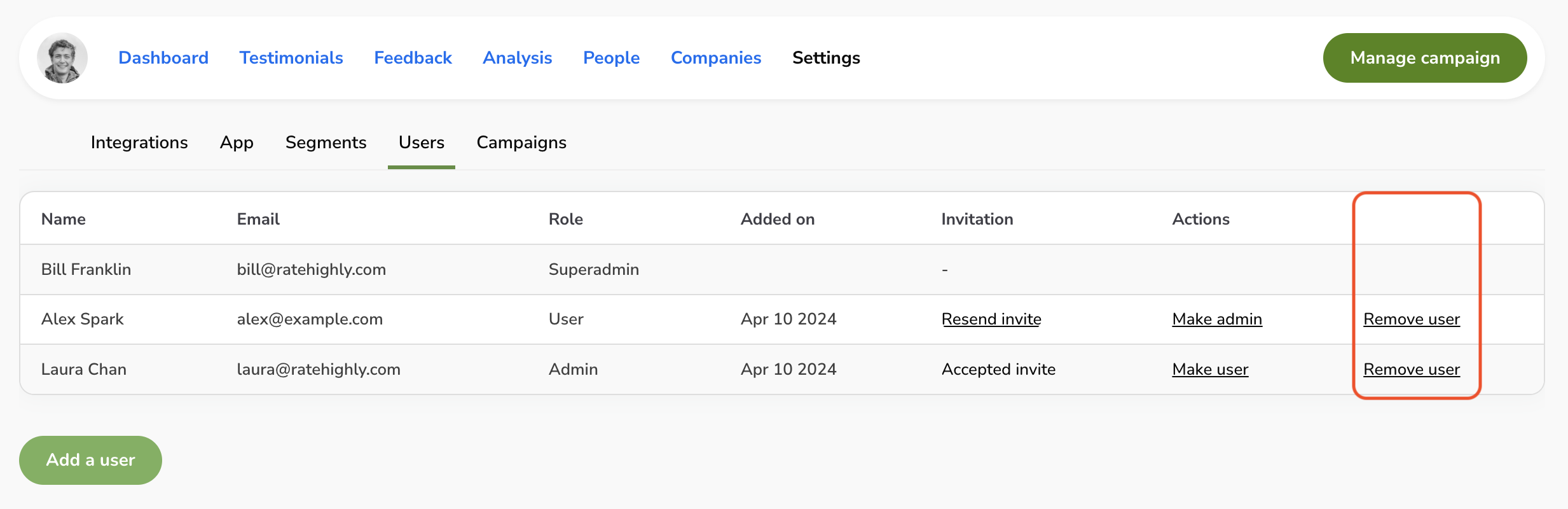 Admins can remove other users from your RateHighly account by clicking Remove user next to them on the Settings > Users page in the dashboard.