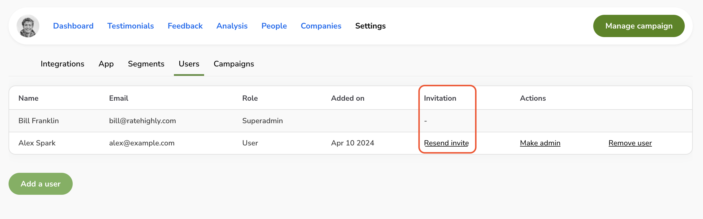 You can resend an invitation by clicking Resend invite. We’ll send another email to your colleague to invite them to your account.