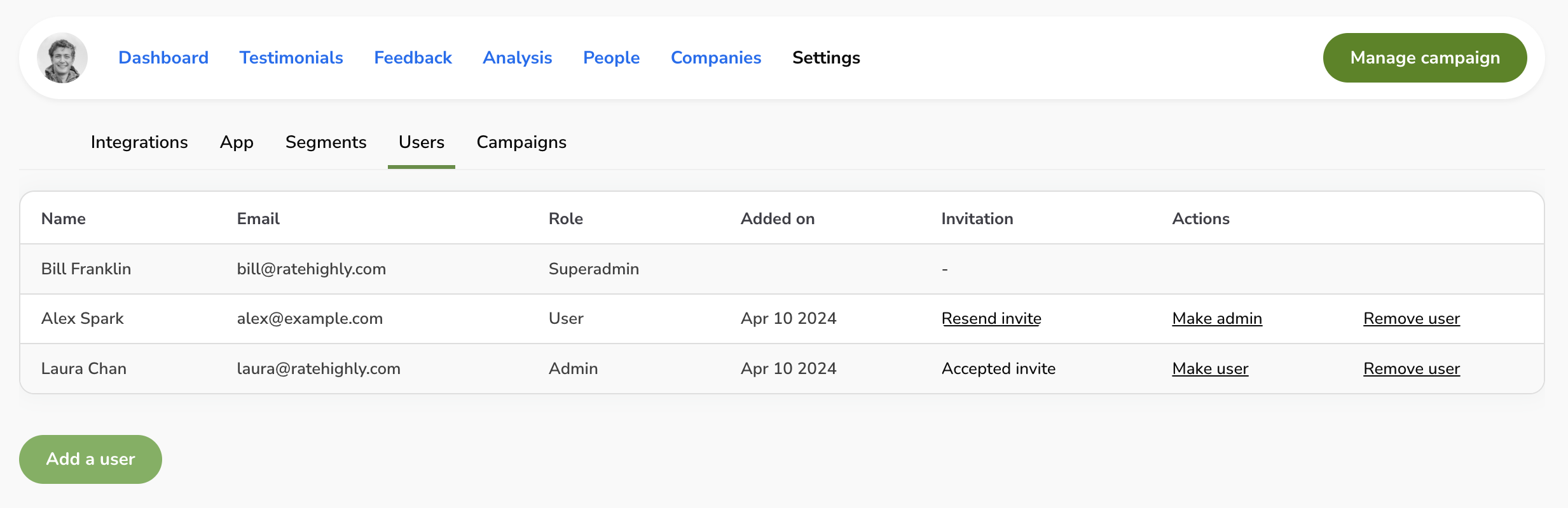 In the RateHighly dashboard go to Settings > Users and click Add a user.