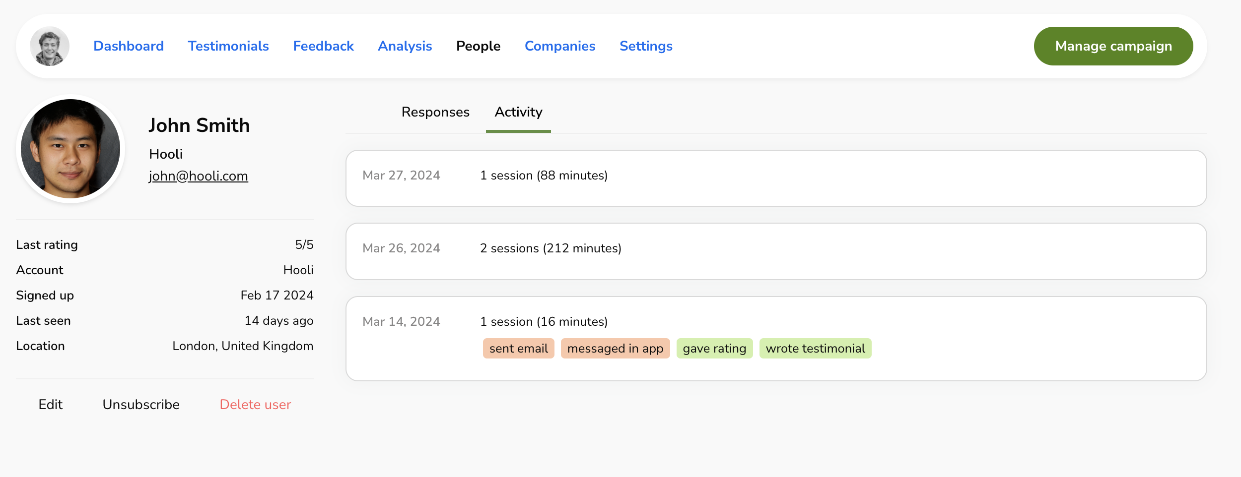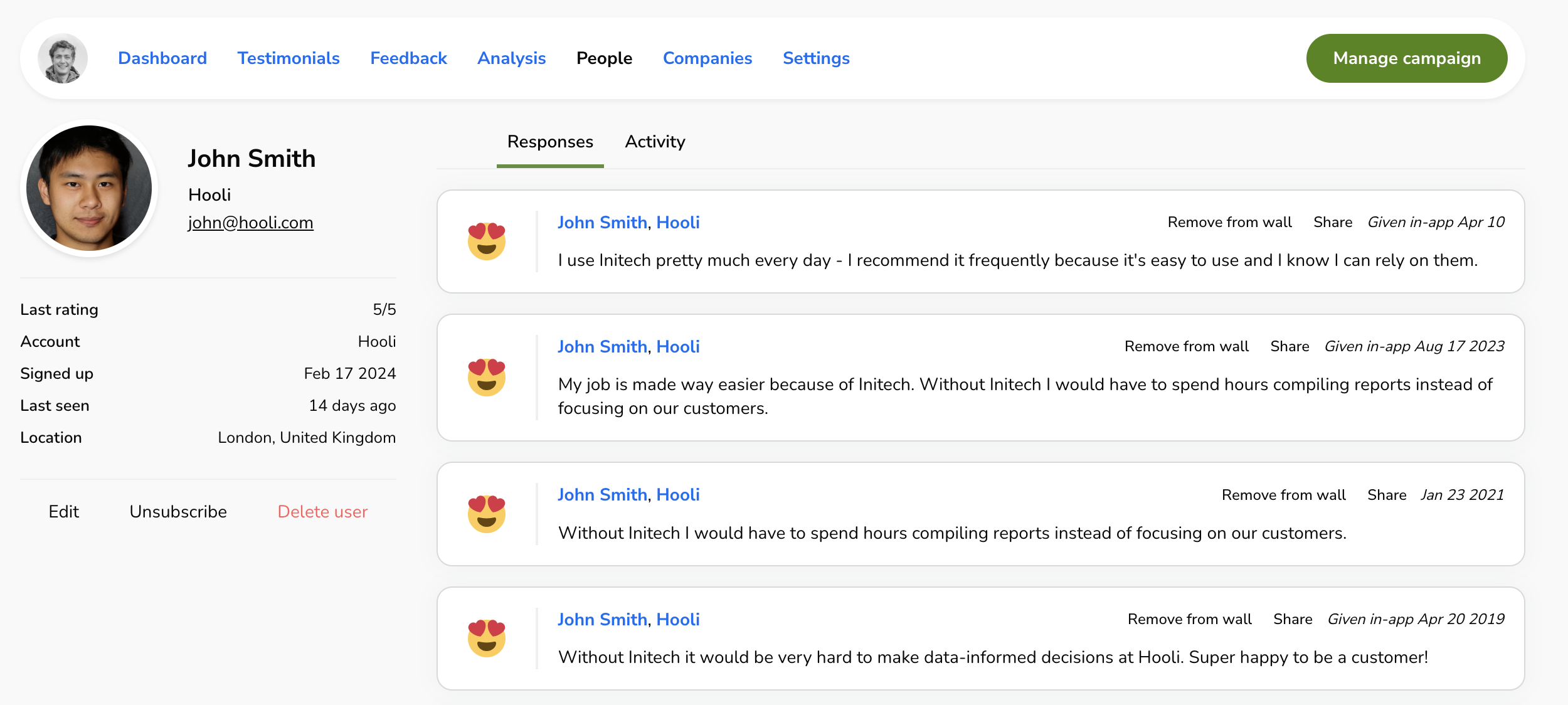 - Click Delete user to remove the user’s profile and all of their activity and responses (including testimonials and feedback).