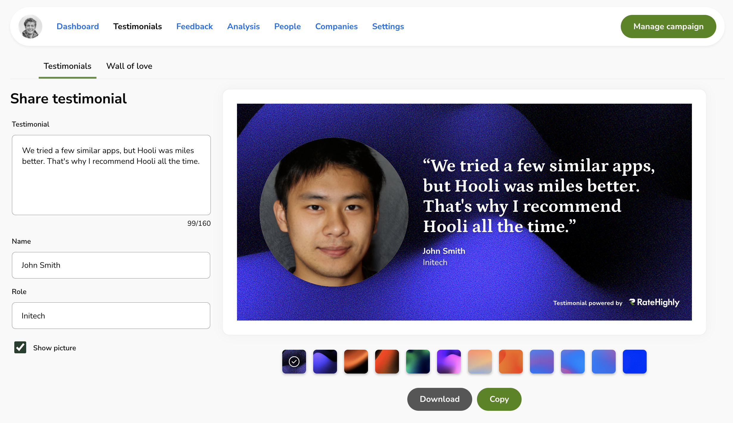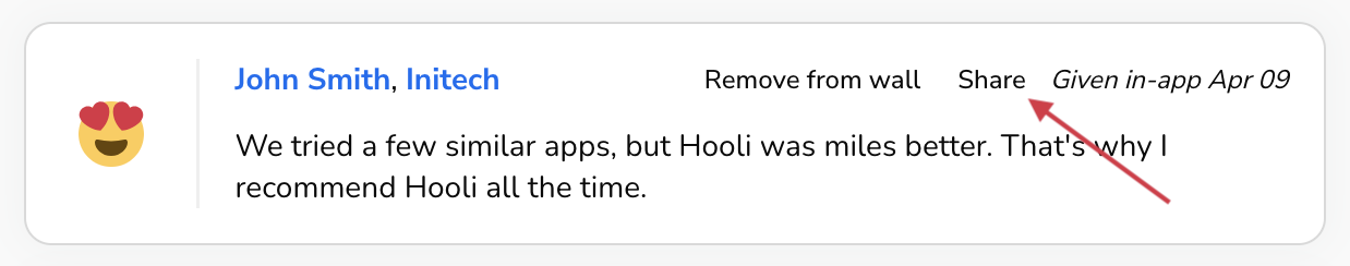 You can generate an image from a testimonial by clicking Share on a testimonial in the RateHighly dashboard.