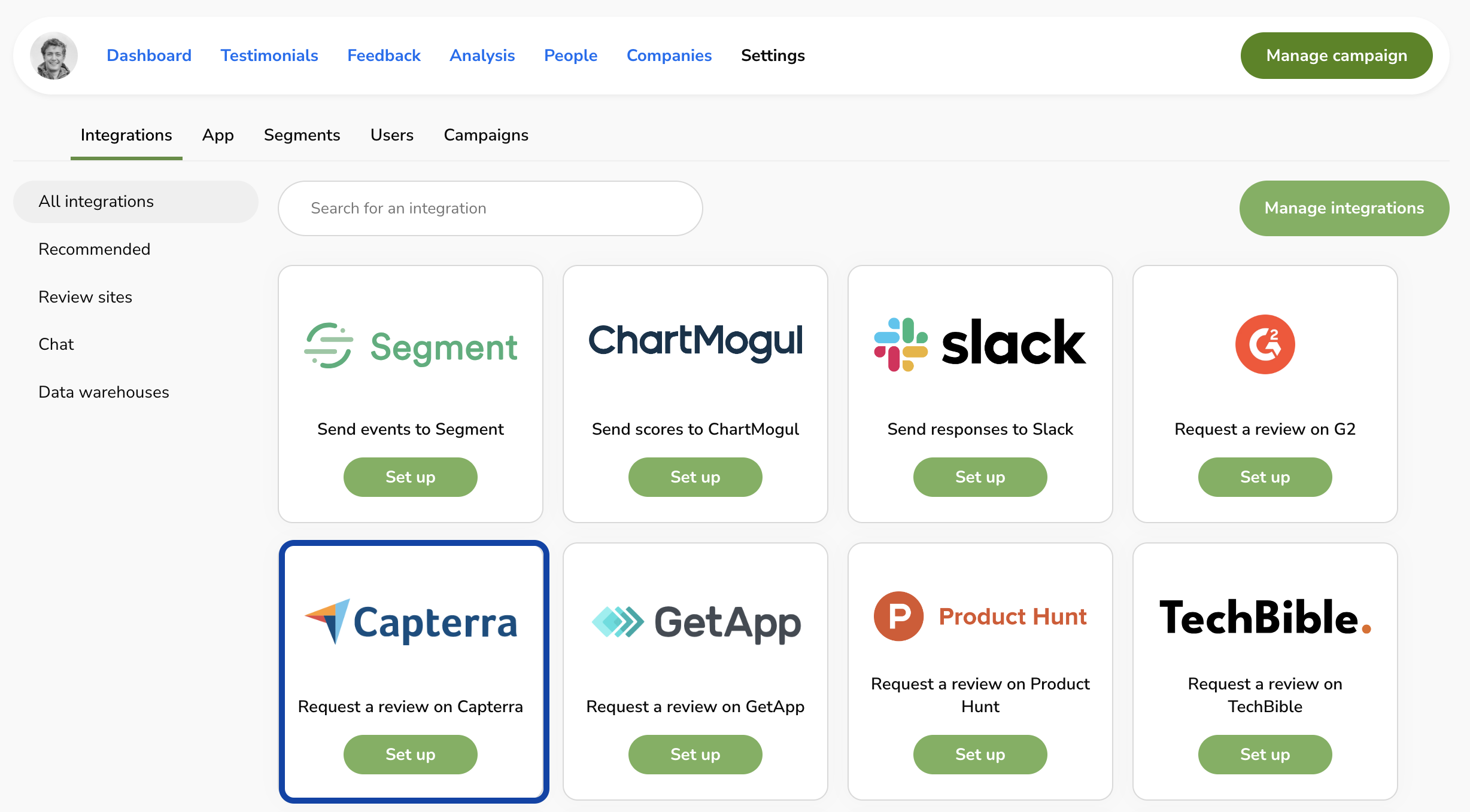 After a user writes a testimonial or gives a rating you can ask them to write a review for you on Capterra. This also works if the rating was given in a third-party survey tool like Survicate or Satismeter.