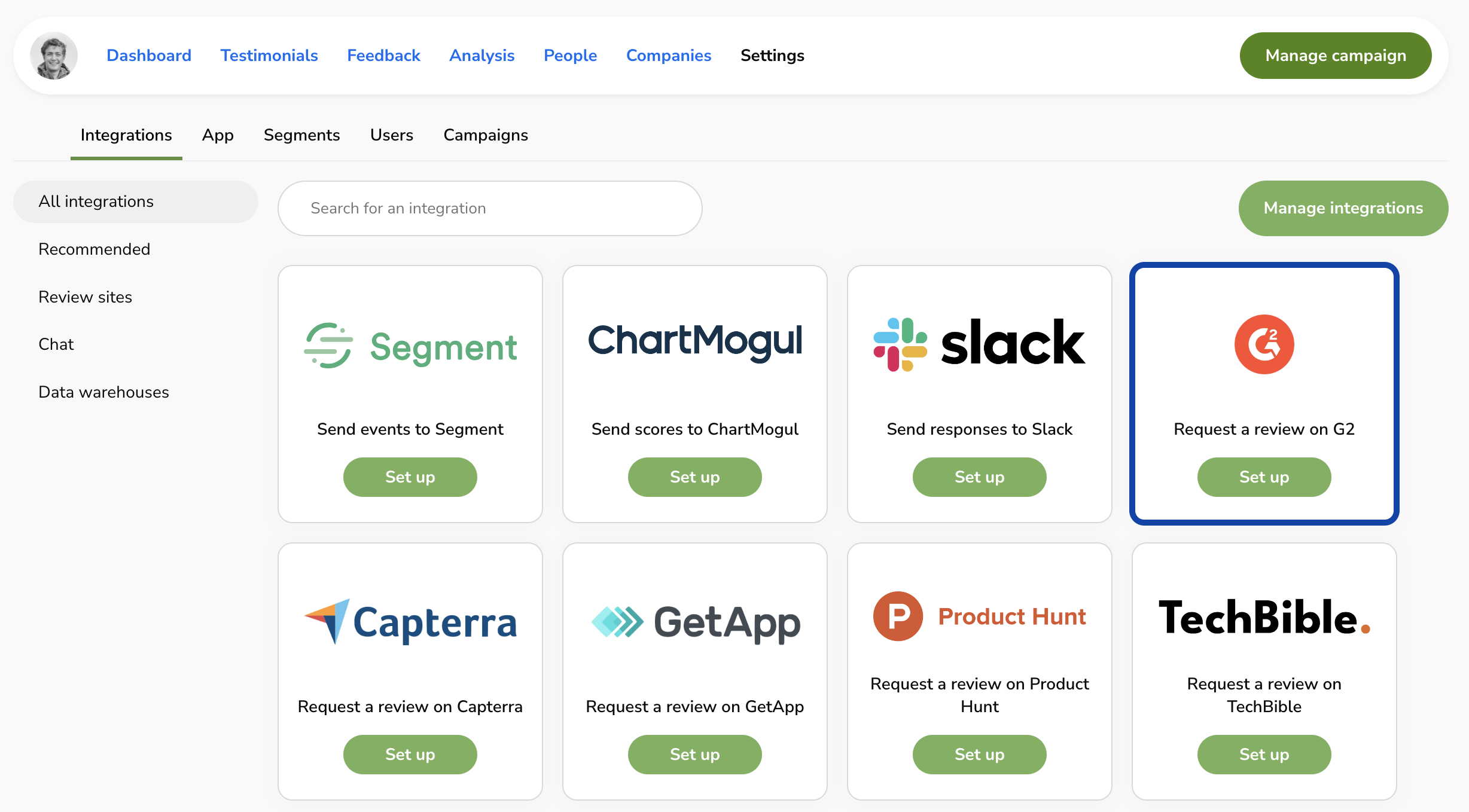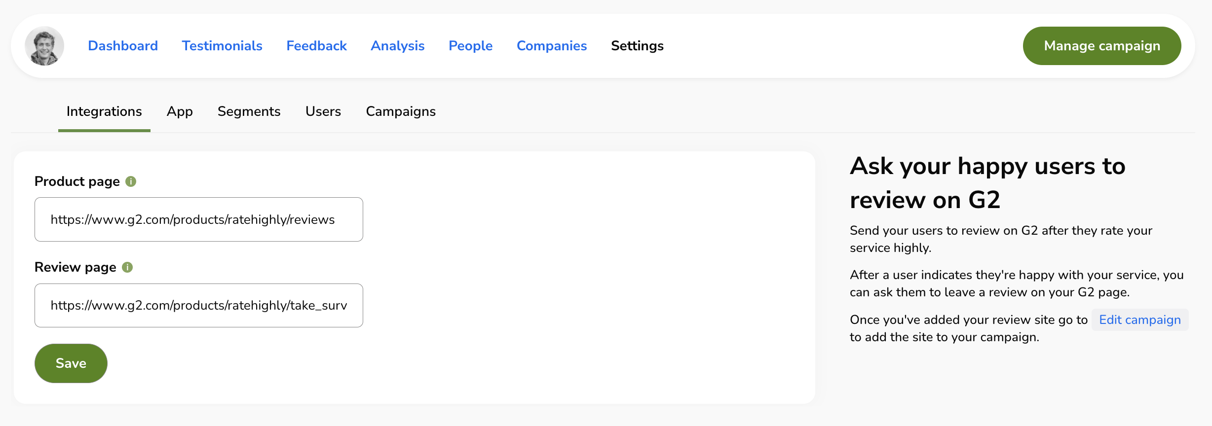 After a user writes a testimonial or gives a rating you can ask them to write a review for you on G2. This also works if the rating was given in a third-party survey tool like Survicate or Satismeter.