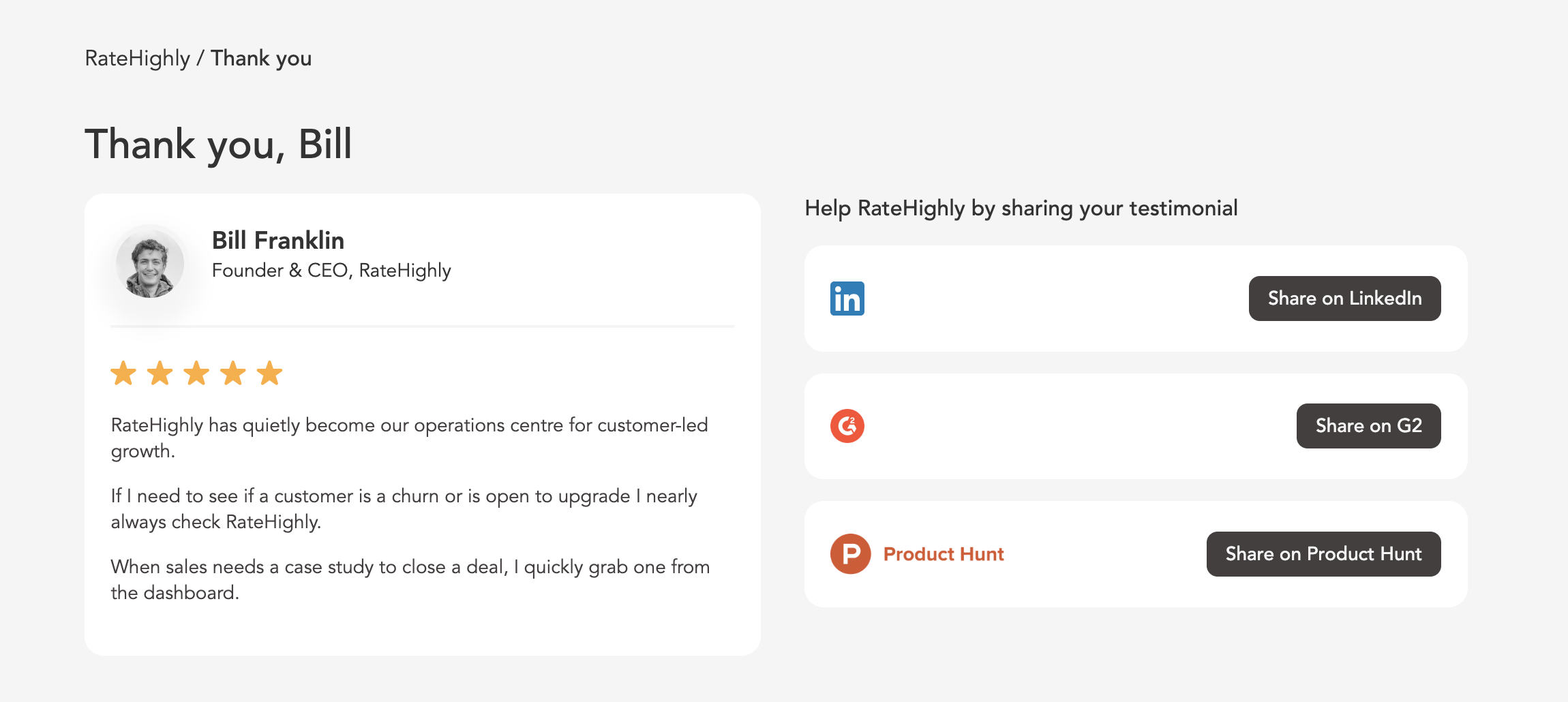 After a user writes a testimonial or gives a rating you can ask them to write a review for you on Salesforce. This also works if the rating was given in a third-party survey tool like Survicate or Satismeter.